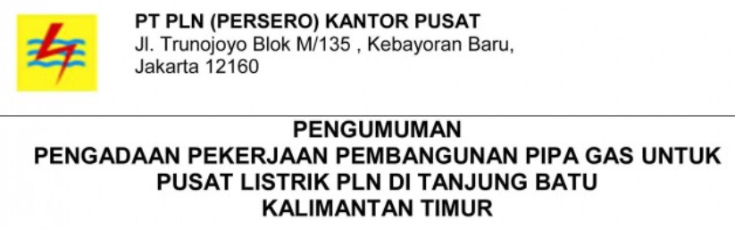 Posted in Pengumuman/Notification | Tagged API 5L, jaringan pipa gas, kalimantan, kalimantan timur, kaltimra, Kantor Pusat, Lelang Pipa, Pengumuman, pipa gas, pipeline, piping, PK-52, PT PLN Persero, pusat listrik PLN, tanjung batu, Tender Pipa, Trunojoyo | Leave a comment